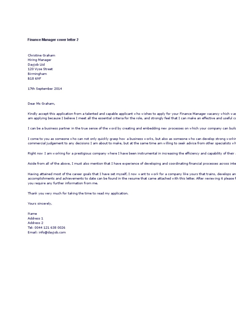This covering letter will show you how to demonstrate to prospective employers your ability to manage all financial matters, including statutory further to your advertisement on the dayjob.com website, i would like to apply for your finance manager vacancy.